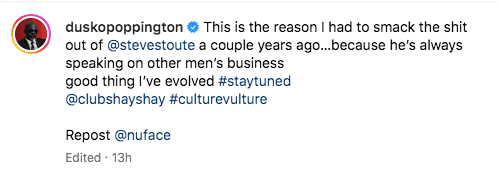 “This is the reason I had to smack the shit out of @stevestoute a couple of years ago…because he’s always speaking on other men’s business good thing I’ve evolved.”