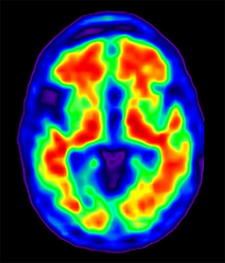 Subjects with higher levels of beta-amyloid, shown in red in this brain scan, showed less activity in brain regions involved in working memory as they engaged in a cognitively demanding task. FierceMillennial.co image is adapted from the UT Dallas news release.