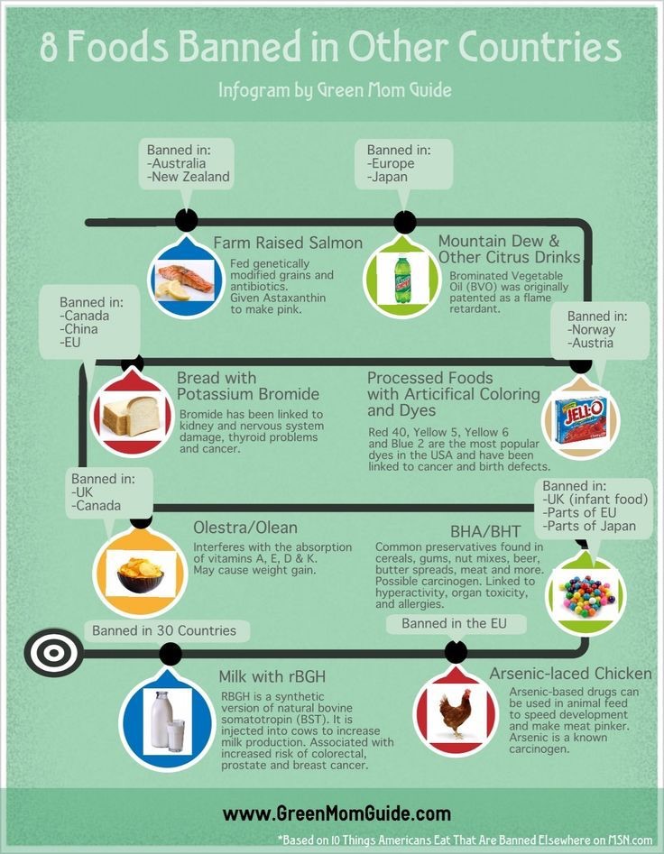 Take a closer look at those labels. Just because something says “made with real fruit” doesn’t mean it’s not also made with high-fructose corn syrup (which, by the way, is banned or restricted in several countries). And just because your favorite snack is “fat-free” doesn’t mean it’s not packed with sodium and preservatives that could be banned elsewhere.