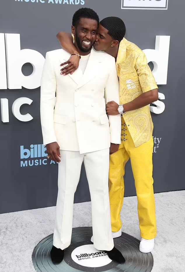 Show of support: One of Diddy’s three sons Christian, 24, also hit the red carpet and planted a kiss on his dad’s cheek